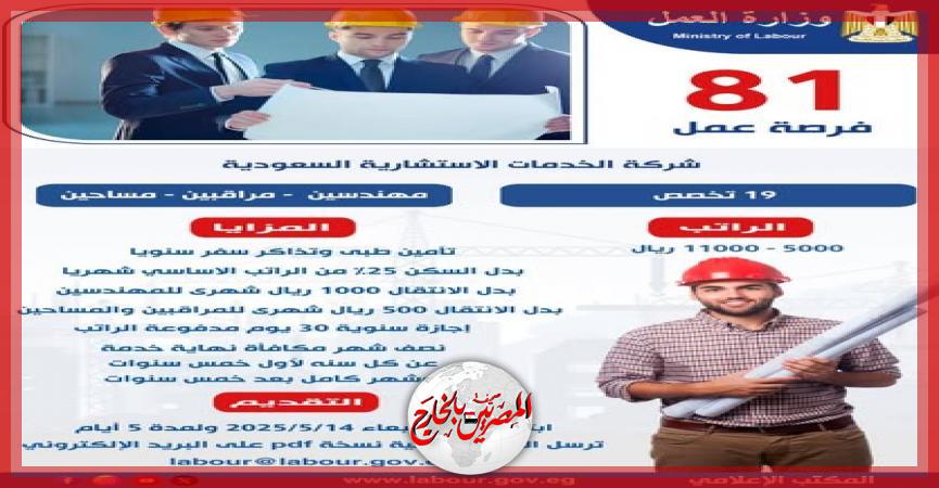 أعلن وزير العمل السيد / محمد جبران ،اليوم الأربعاء عن توفير 81 فرصة عمل للكوادر المصرية للعمل في مجال القطاع الهندسي بشركة الخدمات الاستشارية السعودية بالمملكة العربية السعودية ، وأوضح الوزير أن هذه الفرص الجديدة وفرها مكتب التمثيل العمالي بسفارة جمهورية مصر العربية بالرياض بالتنسيق مع الإدارة المركزية للعلاقات الدولية ، والإدارة العامة للتشغيل ، ودعا الشباب المتخصص في المجالات- المرفقة مع هذا البيان بالرواتب حسب التخصص- تقديم السيرة الذاتية من اليوم الأربعاء الموافق 14-5-2025 ، ولمدة 5 أيام على البريد الالكتروني التالي: [email protected]