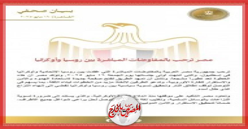 رحبت جمهورية مصر العربية بالمفاوضات المباشرة التي عُقدت بين روسيا الاتحادية وأوكرانيا في إسطنبول والتي انتهت أولى جلساتها يوم أمس /الجمعة/.