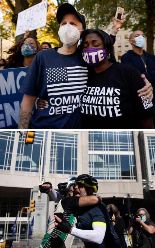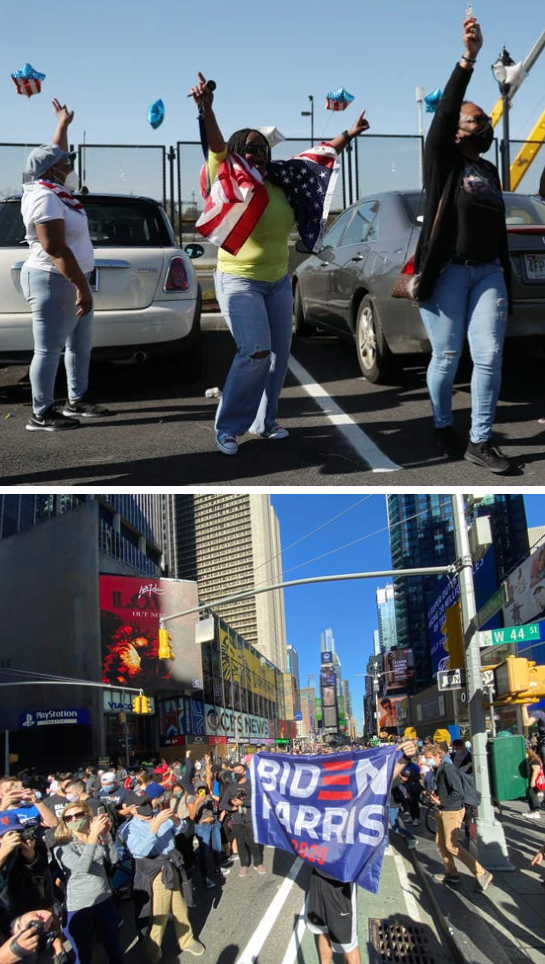 وخرج أنصار بايدن، في مسيرات احتفالية في عموم شوارع أمريكا مستخدمين عرباتهم في ولايات نيويورك، ولوس أنجلوس، وفيلادلفيا، ووفقًا لصحيفة "يو.إس.إيه. توداي".