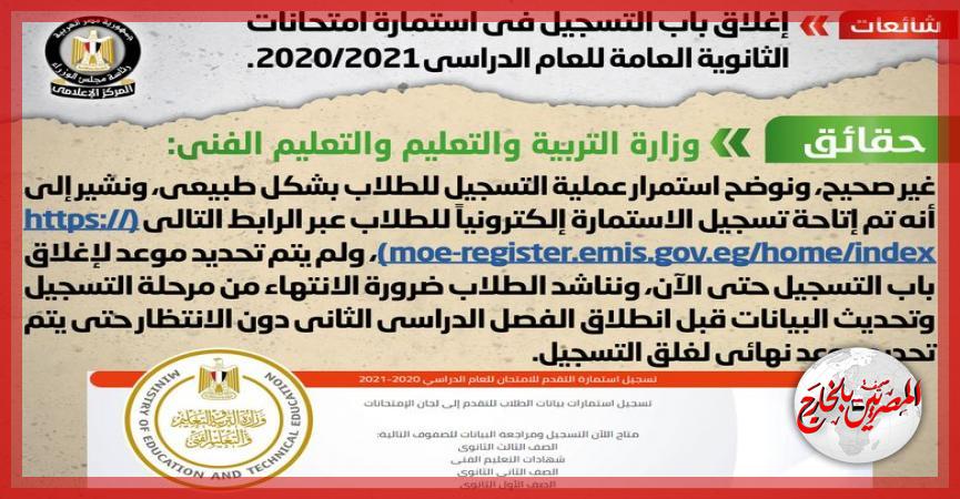 انتشر في بعض المواقع الإلكترونية وصفحات التواصل الاجتماعي أنباء بشأن إغلاق باب التسجيل في استمارة امتحانات الثانوية العامة للعام الدراسي 2020/2021، وقد قام المركز الإعلامي لمجلس الوزراء بالتواصل مع وزارة التربية والتعليم والتعليم الفني، والتي نفت تلك الأنباء، مُؤكدةً أنه لا صحة لإغلاق باب التسجيل في استمارة امتحانات الثانوية العامة للعام الدراسي 2020/2021، مُوضحةً استمرار عملية التسجيل للطلاب بشكل طبيعي، مُشيرةً إلى أنه تم إتاحة تسجيل الاستمارة إلكترونياً للطلاب عبر الرابط التالي (https://moe-register.emis.gov.eg/home/index)، ولم يتم تحديد موعد لإغلاق باب التسجيل حتى الآن، مُناشدةً الطلاب ضرورة الانتهاء من مرحلة التسجيل وتحديث البيانات قبل انطلاق الفصل الدراسي الثاني دون الانتظار حتى يتم تحديد موعد نهائي لغلق التسجيل.