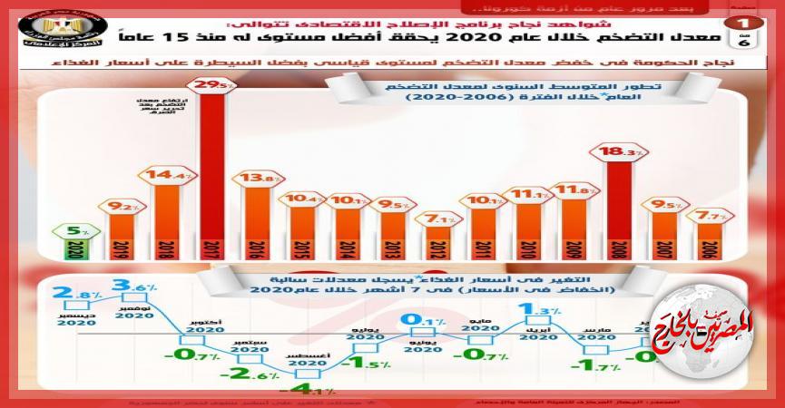 وفي هذا الصدد، نشر المركز الإعلامي لمجلس الوزراء، تقريراً تضمن إنفوجرافات تسلط الضوء على تتابع شواهد نجاح برنامج الإصلاح الاقتصادي، حيث سجل معدل التضخم خلال عام 2020 أفضل مستوى له منذ 15 عاماً، وذلك على الرغم من أزمة كورونا.