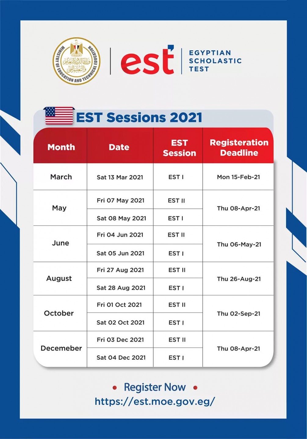 أعلنت وزارة التربية والتعليم والتعليم الفنى جدول امتحانات EST للعام الدراسي 2020-2021 الامتحان المصري EST هو المؤهل الوحيد لطلاب الدبلومة الأمريكية لتنسيق الجامعات المصرية مع فترة سماح لمدة 6 شهور لطلاب Grades 11, 12 من 15 فبراير 2021 حتى 15 اغسطس 2021 (وليس بأثر رجعي).