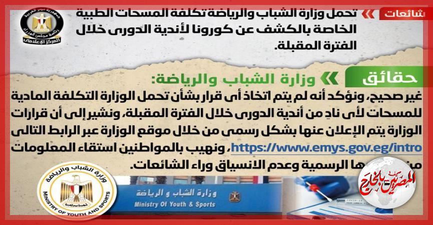 تردد في بعض وسائل الإعلام والمواقع الإلكترونية وصفحات التواصل الاجتماعي أنباء بشأن تحمل وزارة الشباب والرياضة تكلفة المسحات الطبية الخاصة بالكشف عن كورونا لأندية الدوري خلال الفترة المقبلة، وقد قام المركز الإعلامي لمجلس الوزراء بالتواصل مع وزارة الشباب والرياضة، والتي نفت تلك الأنباء، مُؤكدةً أنه لا صحة لتحمل وزارة الشباب والرياضة تكلفة المسحات الطبية الخاصة بالكشف عن كورونا لأندية الدوري خلال الفترة المقبلة، وأنه لم يتم اتخاذ أي قرار بشأن تحمل الوزارة التكلفة المادية للمسحات لأي نادِ من أندية الدوري خلال الفترة المقبلة، مُشيرةً إلى أن قرارات الوزارة يتم الإعلان عنها بشكل رسمي من خلال موقع الوزارة عبر الرابط التالي"https://www.emys.gov.eg/intro"، مُهيبةً بالمواطنين استقاء المعلومات من مصادرها الرسمية وعدم الانسياق وراء الشائعات.
