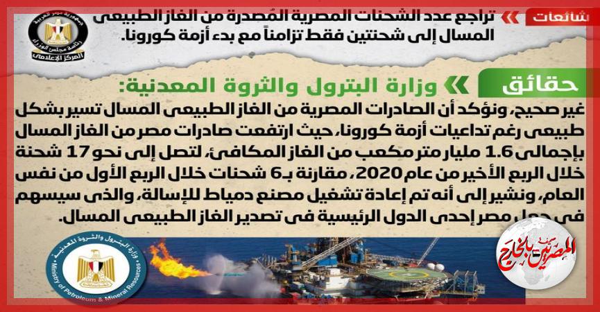 انتشر في بعض المواقع الإلكترونية وصفحات التواصل الاجتماعي أنباء بشأن تراجع عدد الشحنات المصرية المُصدرة من الغاز الطبيعي المسال إلى شحنتين فقط تزامناً مع بدء أزمة كورونا، وقد قام المركز الإعلامي لمجلس الوزراء بالتواصل مع وزارة البترول والثروة المعدنية، والتي نفت تلك الأنباء، مُؤكدةً أنه لا صحة لتراجع عدد الشحنات المصرية المُصدرة من الغاز الطبيعي المسال إلى شحنتين فقط تزامناً مع بدء أزمة كورونا، مُوضحةً أن الصادرات المصرية من الغاز الطبيعي المسال تسير بشكل طبيعي رغم تداعيات أزمة كورونا، حيث ارتفعت صادرات مصر من الغاز المسال بإجمالي 1.6 مليار متر مكعب من الغاز المكافئ، لتصل إلى نحو 17 شحنة خلال الربع الأخير من عام 2020، مقارنة بـ 6 شحنات خلال الربع الأول من نفس العام، مُشيرةً إلى أنه تم إعادة تشغيل مصنع دمياط للإسالة، والذي سيسهم في جعل مصر إحدى الدول الرئيسية في تصدير الغاز الطبيعي المسال.