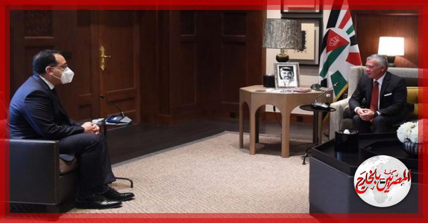 جاء ذلك خلال استقبال العاهل الأردني، الدكتور مصطفى مدبولي، رئيس مجلس الوزراء، بقصر الحسينية، وذلك في إطار الزيارة التي يقوم بها رئيس الوزراء إلى العاصمة الأردنية، عمان، لرئاسة وفد مصر في اجتماعات الدورة الـ29 للجنة المشتركة.