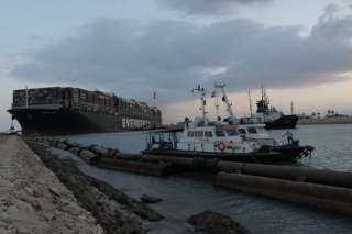 الكراكة مشهور تواصل أعمال التكريك لتعويم السفينة الجانحة بالقناة