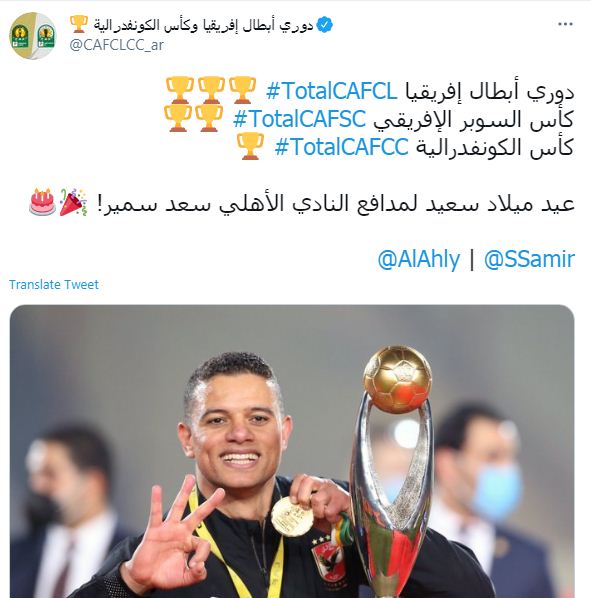 حرص الاتحاد الافريقي لكرة القدم "الكاف" على تهنئة النجم المصري سعد سمير، مدافع النادي الأهلي، بعيد ميلاده رقم 32، ونشر الحساب الرسمي لمسابقات الأندية الإفريقية التابع للكاف على "تويتر"، صورة سعد سمير أمام كأس افريقيا، وهنأه بمناسبة ميلاده قائلا: " عيد ميلاد سعيد لمدافع النادي الأهلي سعد سمير".