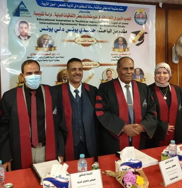 حصل الباحث حمدي يونس علي يونس، على درجة الدكتوراة بدرجة إمتياز وذلك في الرسالة المقدمة منه بعنوان "التجديد التربوي في التعليم الفني في ضوء متطلبات بعض الاتفاقيات الدولية-دراسة تقويمية".