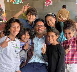 علي ربيع مع مجموعة أطفال في كواليس مسلسل أحسن أب