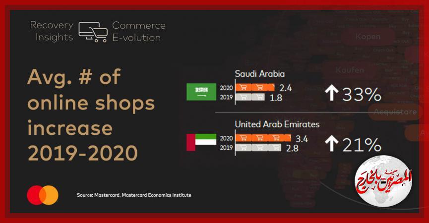 وفي المملكة العربية السعودية، كانت الزيادة في الإنفاق الاستهلاكي عبر الإنترنت مدفوعة بشكل أساسي بزيادة سنوية بنسبة 33٪ في عدد المتاجر عبر الإنترنت بين عامي 2019 و2020.