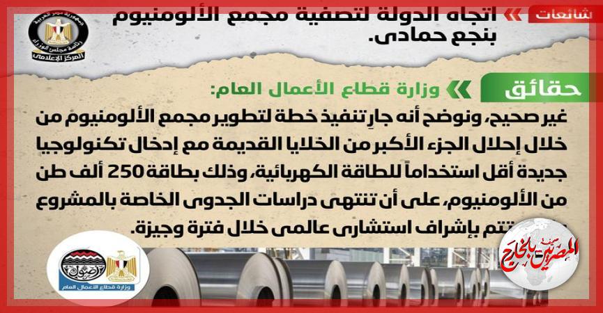 انتشر في بعض المواقع الإلكترونية وصفحات التواصل الاجتماعي أنباء بشأن اتجاه الدولة لتصفية مجمع الألومنيوم بنجع حمادي، وقد قام المركز الإعلامي لمجلس الوزراء بالتواصل مع وزارة قطاع الأعمال العام، والتي نفت تلك الأنباء، مُؤكدةً أنه لا صحة لتصفية مجمع الألومنيوم بنجع حمادي، مُوضحةً أنه جارِ تنفيذ خطة لتطوير مجمع الألومنيوم بنجع حمادي من خلال إحلال الجزء الأكبر من الخلايا القديمة مع إدخال تكنولوجيا جديدة أقل استخداماً للطاقة الكهربائية، وذلك بطاقة 250 ألف طن من الألومنيوم، على أن تنتهي دراسات الجدوى الخاصة بالمشروع والتي تتم بإشراف استشاري عالمي خلال فترة وجيزة.
