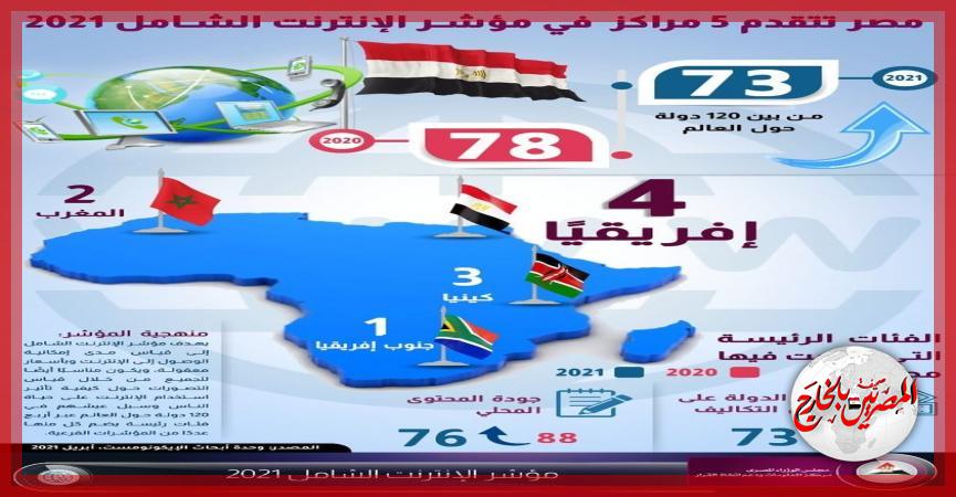رصد مركز المعلومات ودعم اتخاذ القرار التابع لمجلس الوزراء تقدم مصر في مؤشر الإنترنت الشامل 2021، لتتقدم ترتيبها في المؤشر 5 مراكز؛ لتصبح في المركز الـ73 في 2021 من بين 120 دولة عالميًّا، مقارنةً بالمركز الـ78 في 2020.