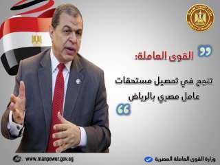و أعلن الوزير، نجاح مكتب التمثيل العمالي التابع لوزارة القوى العاملة، بالقنصلية العامة المصرية بجدة بالمملكة العربية السعودية، في الحصول على مستحقات 5 مواطنين مصريين، بلغت 101 آلاف و162 ريالا سعوديا بما يعادل 422 ألفا و857 جنيها مصريا تقريبا، وتوفير 20 فرصة عمل عن طريق نقل الكفالة بشركة مفتاح التوصيل لأجهزة الحاسب الآلي المحدودة بجدة بالمملكة بجدة براتب 4000 ريال ، و8 ساعات عمل ، وإجازة أسبوعية .