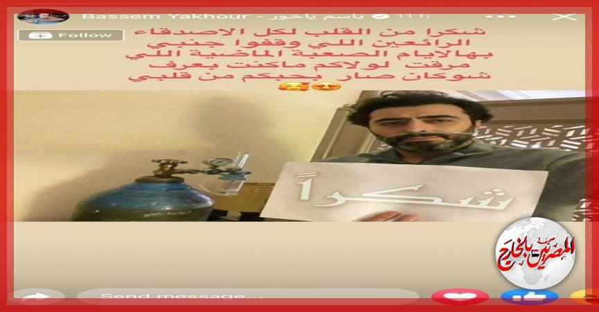 نشر الفنان السوري، باسم ياخور، صورة له عبر صفحته الرسمية على فيسبوك، حيث ظهر بالصورة وإلى جانبه أسطوانة الأوكسجين وحمل بيده ورقة كتب عليها كلمة "شكرا".