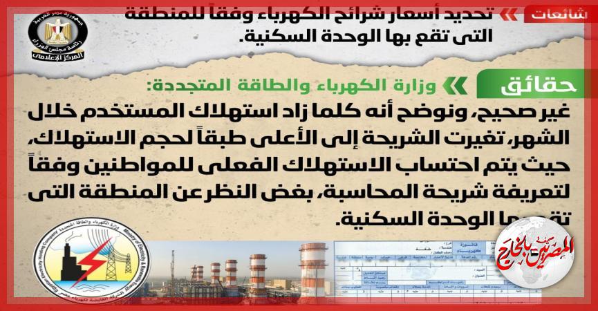 تداولت بعض المواقع الإلكترونية وصفحات التواصل الاجتماعي أنباء بشأن تحديد أسعار شرائح الكهرباء وفقاً للمنطقة التي تقع بها الوحدة السكنية، وقد قام المركز الإعلامي لمجلس الوزراء بالتواصل مع وزارة الكهرباء والطاقة المتجددة، والتي نفت تلك الأنباء، مُؤكدةً أنه لا صحة لتحديد أسعار شرائح الكهرباء وفقاً للمنطقة التي تقع بها الوحدة السكنية، موضحةً أنه كلما زاد استهلاك المستخدم خلال الشهر، تغيرت الشريحة إلى الأعلى طبقاً لحجم الاستهلاك، حيث يتم احتساب الاستهلاك الفعلي للمواطنين وفقاً لتعريفة شريحة المحاسبة بغض النظر عن المنطقة التي تقع بها الوحدة السكنية.