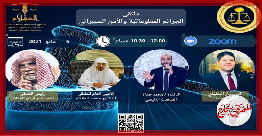 صرح المستشار التنفيذي خالد السيد عن انعقاد ملتقى الجرائم المعلوماتية والامن السيبراني عبر برنامج زووم في تمام العاشرة ونص بتوقيت مدينة الرياض من مساء يوم الاربعاء 23 رمضان 1442 الموافق5 مايو 2021 بحضور الأمين العام للملتقى الدكتور محمد العقلا والدكتور محمد حمزة المتحدث الرسمي للملتقى دكتوراة في القانون والاقتصاد بكلية الحقوق جامعة عين شمس والمحاضر المتخصص في التحول الرقمي والجرائم الالكترونية والأمن السيبراني ورئيس أكاديمية القمة العربية الدولية للدراسات المتطورة والبحث العلمي
