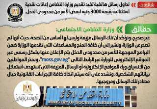 الحكومة تنفى شائعة: تداول رسائل هاتفية تفيد تقديم وزارة التضامن إعانات نقدية استثنائية بقيمة 3000 جنيه لبعض الأسر