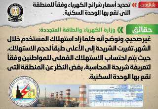 الحكومة تنفى شائعة: تحديد أسعار شرائح الكهرباء وفقاً للمنطقة التي تقع بها الوحدة السكنية