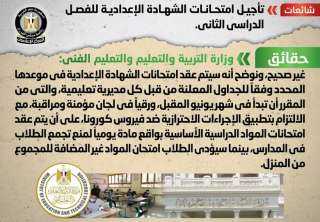 وتواصل المركز الإعلامي لمجلس الوزراء مع وزارة التربية والتعليم والتعليم الفني، والتي نفت تلك الأنباء، وأكدت أنه سيتم عقد امتحانات الشهادة الإعدادية في موعدها المحدد وفقاً للجداول المعلنة من قبل كل مديرية تعليمية، والتي من المقرر أن تبدأ في شهر يونيو المقبل ورقياً في لجان مؤمنة ومراقبة، مع الالتزام بتطبيق الإجراءات الاحترازية ضد فيروس كورونا.