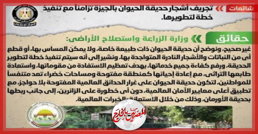 وأوضح المركز الإعلامي - في بيان اليوم / الخميس/ - أنه قام بالتواصل مع وزارة الزراعة واستصلاح الأراضي والتي نفت تلك الأنباء، مُؤكدةً أنه لا صحة لتجريف أشجار حديقة الحيوان بالجيزة تزامناً مع تنفيذ خطة لتطويرها.